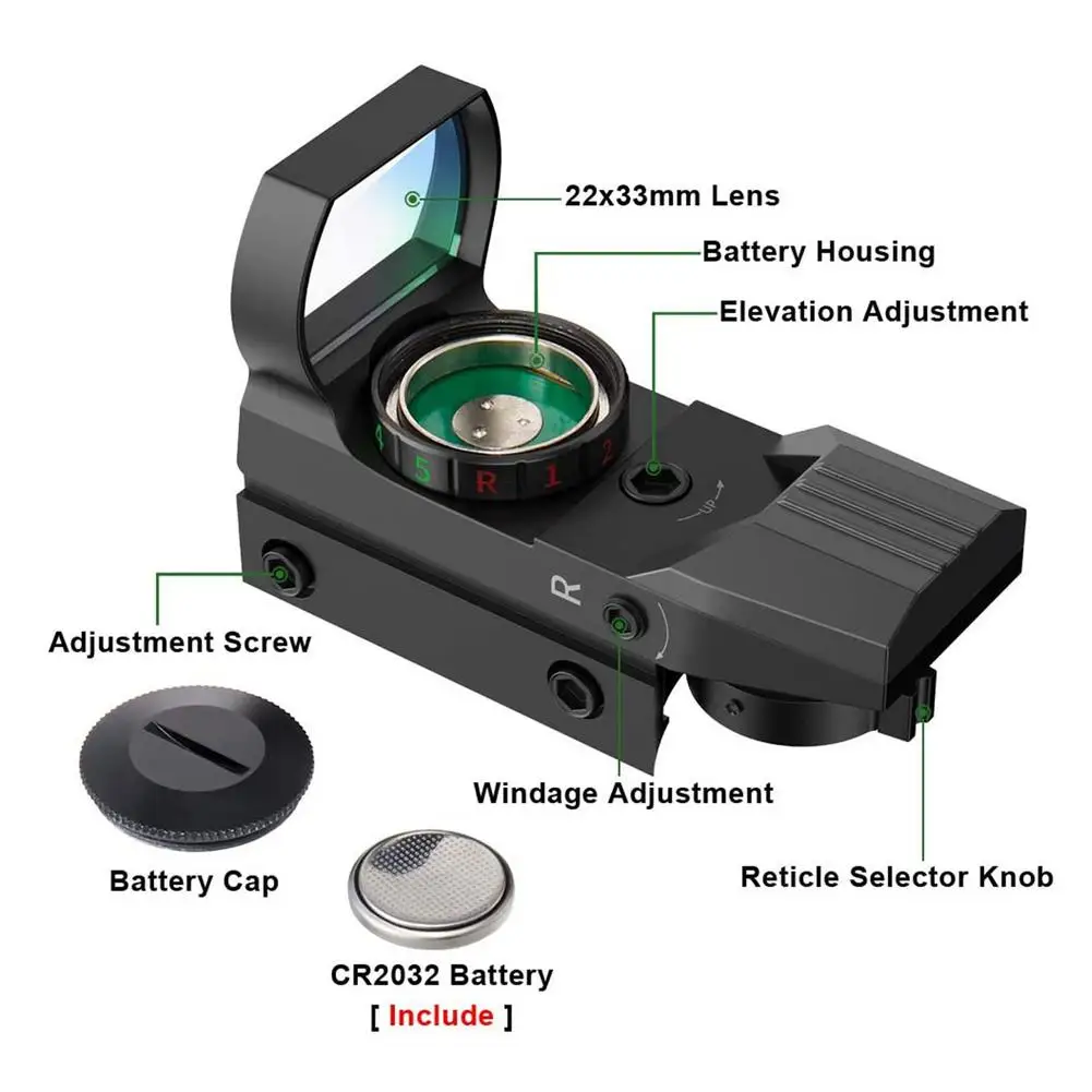 1、Detail Description: Tubeless design with about 33mm/1.30 inch reflex lens aperture provides a wide field of view. Made of durable and solid aluminum alloy; 2 allen screws; lens cover;one manual instructions . Using one CR2032 battery,included;low power consumption for long battery life; when the reticle grow dim or not light; you need unscrew battery cover and replace the battery.